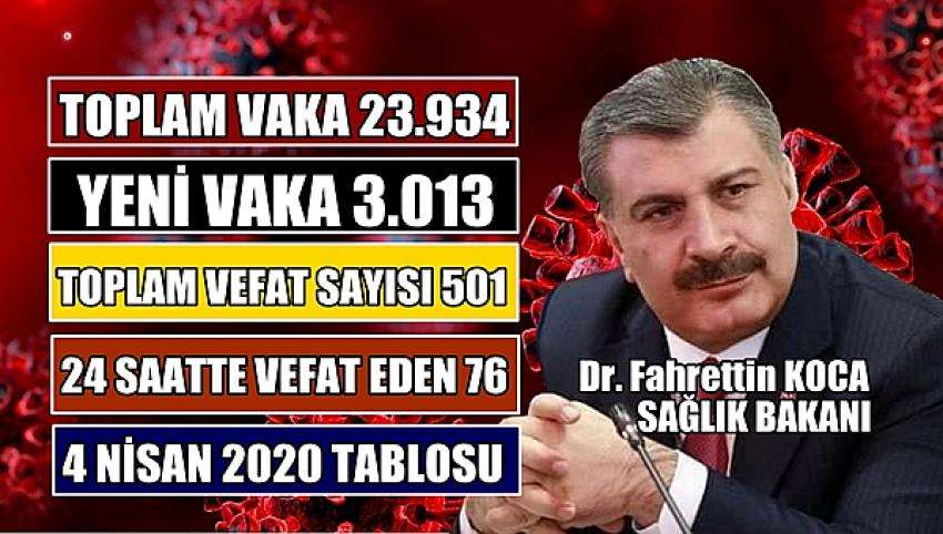 Bakan Koca, Türkiye'de Koronavirüsten 4 Nisan 2020 tarihinde can kaybının 501'e yükseldiğini, son 24 saatte hayatını kaybeden kişilerin ise 76 olduğunu açıkladı. Ayrıca toplam vakanın ise 23 bin 934, yeni vaka sayısının da 3 bin 013'e yükseldiğini belirtti. İyileşen hasta sayısının da toplamda 786'ye çıktığını kaydeden Sağlık Bakanı Koca; son olarak 302 hastanında iyileştiğini ifade etti.