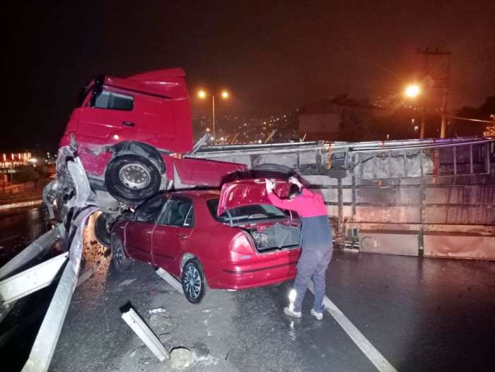 Edinilen bilgiye göre kaza, akşam saatlerinde Kozlu ilçesi Fatih Sitesi mevkisinde yaşandı. Sürücüsü öğrenilemeyen 67 AAT 849 plakalı odun yüklü tır, yağışlı havanın etkisiyle kontrolden çıkarak, 67 ABR 197 plakalı otomobile çarptı. Ardından refüje çıkan tır, karşı yönden gelen 67 ACV 851 plakalı araca da çarparak devrildi. Kazada tırın çarptığı aracın sürücüsü yaralanırken, olay yerine ulaşan sağlık personeli yaralıyı ilk müdahalenin ardından, ambulansla hastaneye kaldırdı. Trafik bir müddet kontrollü olarak sağlanırken, kaza nedeniyle yol trafiğe kapandı. Kazayla ilgili soruşturma başlatıldı.