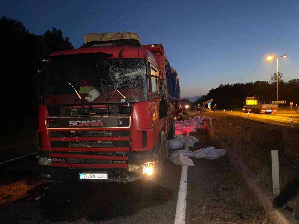 Zonguldak’ın Çaycuma ilçesi Perşembe beldesinde seyir halindeki otomobil şerit değiştirdiği sırada aynı yönde seyir halindeki kamyonun arkadan çarpması nedeniyle kaza meydana geldi. Kazada yaralanan olmazken kamyondaki un çuvalları yola saçıldı.