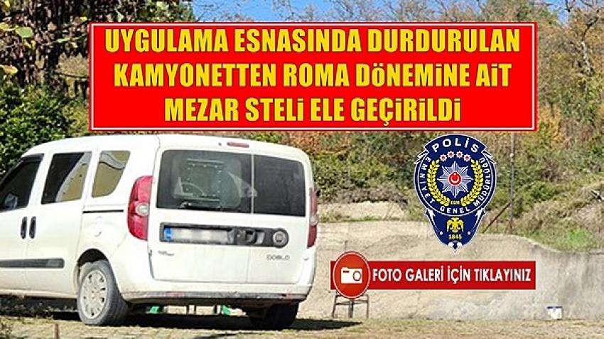 Uygulama esnasında durdurulan kamyonette Roma dönemine ait mezar Steli ele geçirildi.