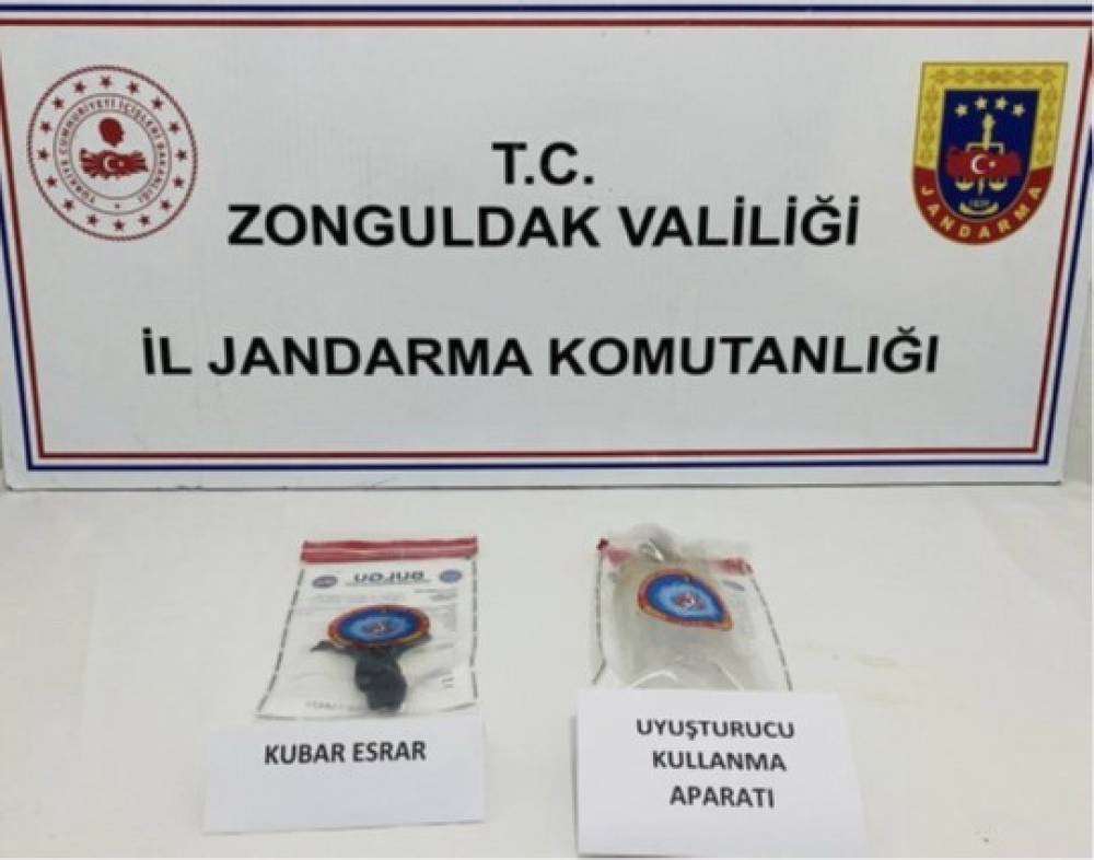 Edinilen bilgiye göre, Zonguldak İl Jandarma Komutanlığı ekiplerince Çaycuma ilçesinde önleyici kolluk devriyesi esnasında bir araçta bulunan 2 şüphelinin uyuşturucu madde kullandığı tespit edildi. Yapılan aramada, 10 gram kubar esrar ve 1 adet uyuşturucu kullanma aparatı ele geçirildi.