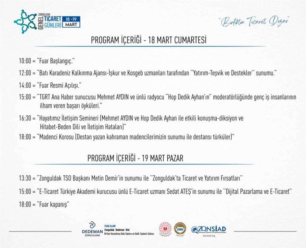 Saat 16.30’da "Hayatımız İletişim Semineri" ile devam edecek olan genel ticaret günlerinin ilk gün finali 18.00’de madenci korosunu ile son bulacak. 19 Mart Pazar günü ise 13.30’da Zonguldak TSO Başkanı Metin Demir’in sunumu ile "Zonguldak’ta ticaret ve yatırım fırsatları" anlatılacak. Saat 15.00’de E-Ticaret Türkiye Akademi kurucusu ünlü e ticaret uzmanı Sedat Ateş’in sunumu ile "Dijital Pazarlama ve E-Ticaret" sunumu gerçekleştirilecek. Ardından fuarın kapanışı gerçekleştirilecek.